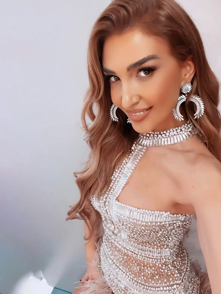 Sleeveless Halter Mini Dress, Sheath Bodycon, Beige Feather Pearl Embellished