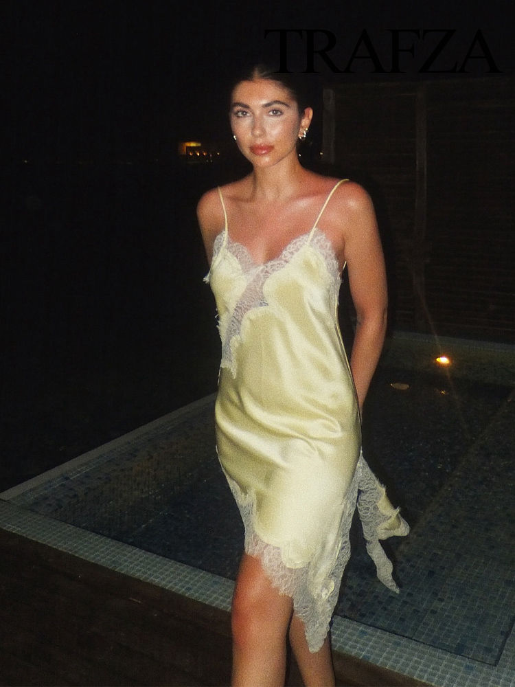 Yellow Satin Lace Splicing Sling Dress Sleeveless Mini Above Knee Irregular Hem
