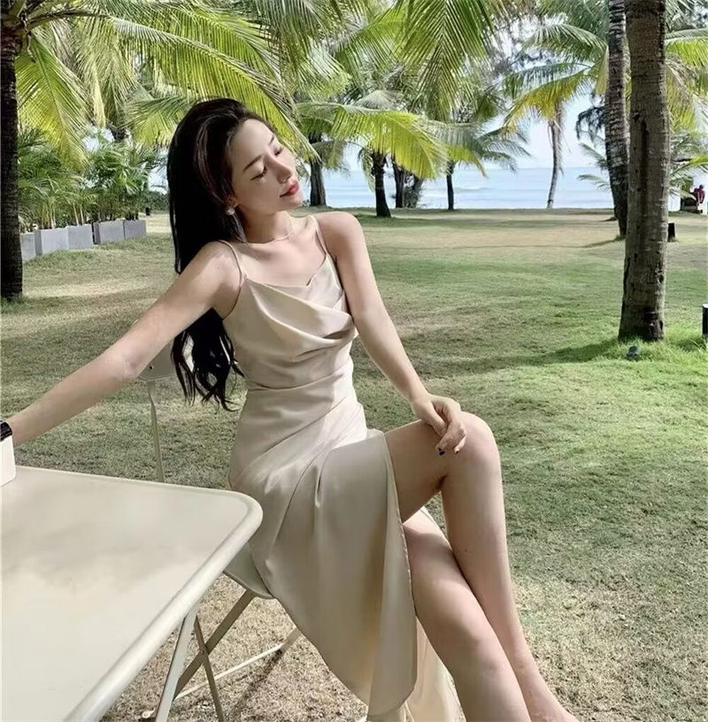 Halter Neck Ankle-Length Dress, Sexy Spaghetti Strap, Solid Sheath, Split Design