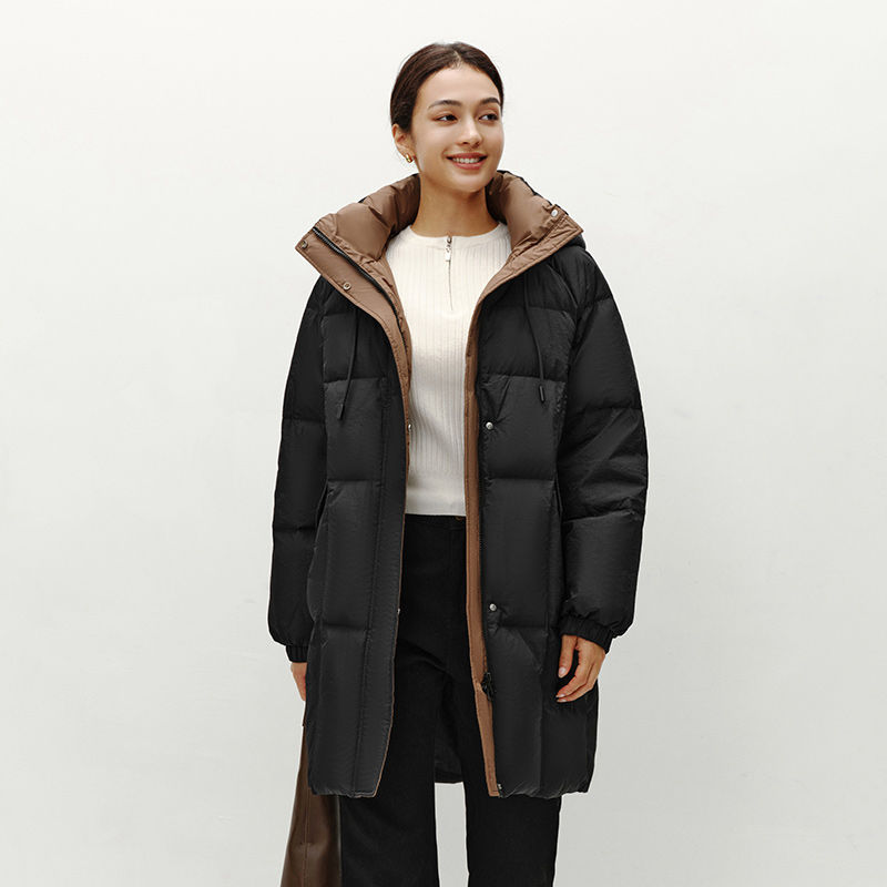 Mid-Length Down Puffer Coat, Hooded Jacket with Zipper, Solid Nylon Shell