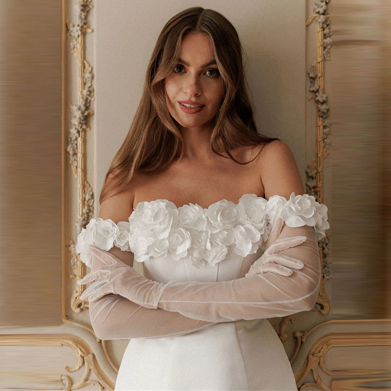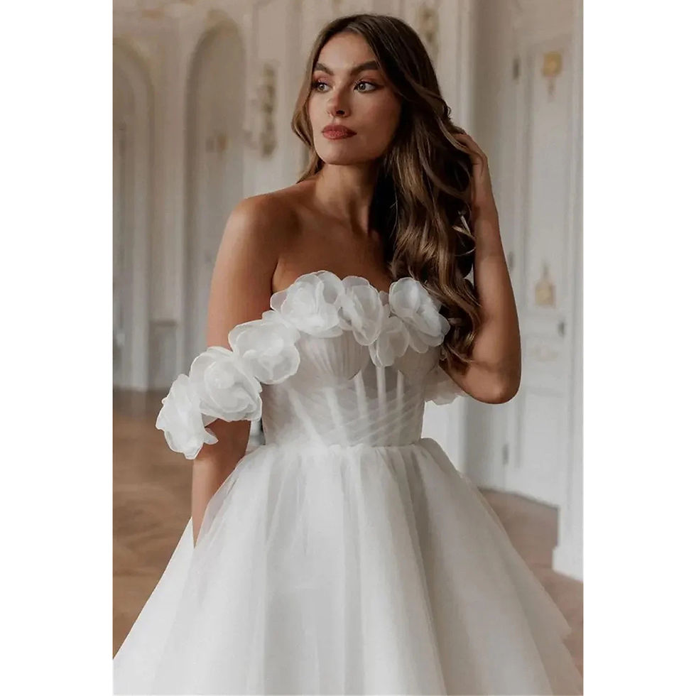 Strapless Sleeveless A-Line Mini Wedding Dresses Off Shoulder Floral Tulle Brida