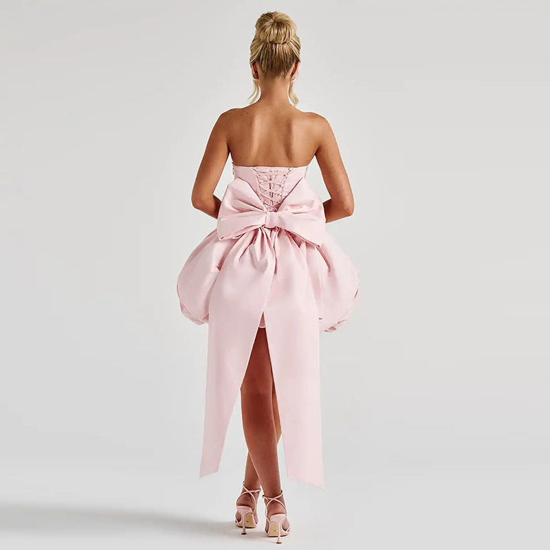 Pink Strapless Mini Prom Dress A-Line with Bow & Pleat, Satin Above Knee Party G