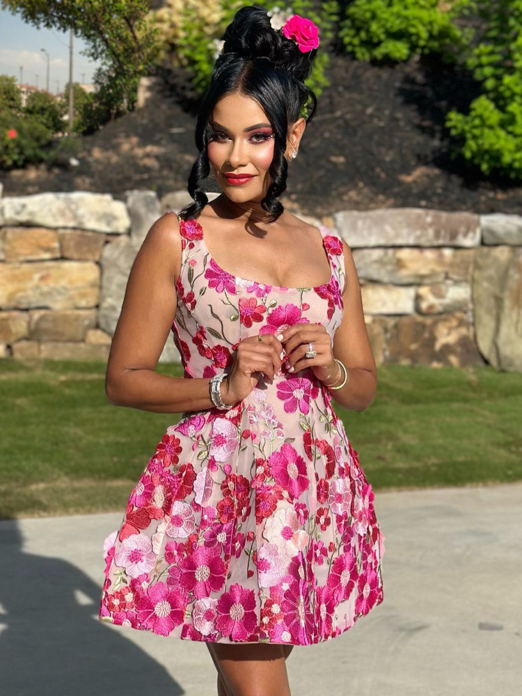 A-Line Mini Dress Floral Applique Lace Square Collar Sleeveless Short Prom Dress