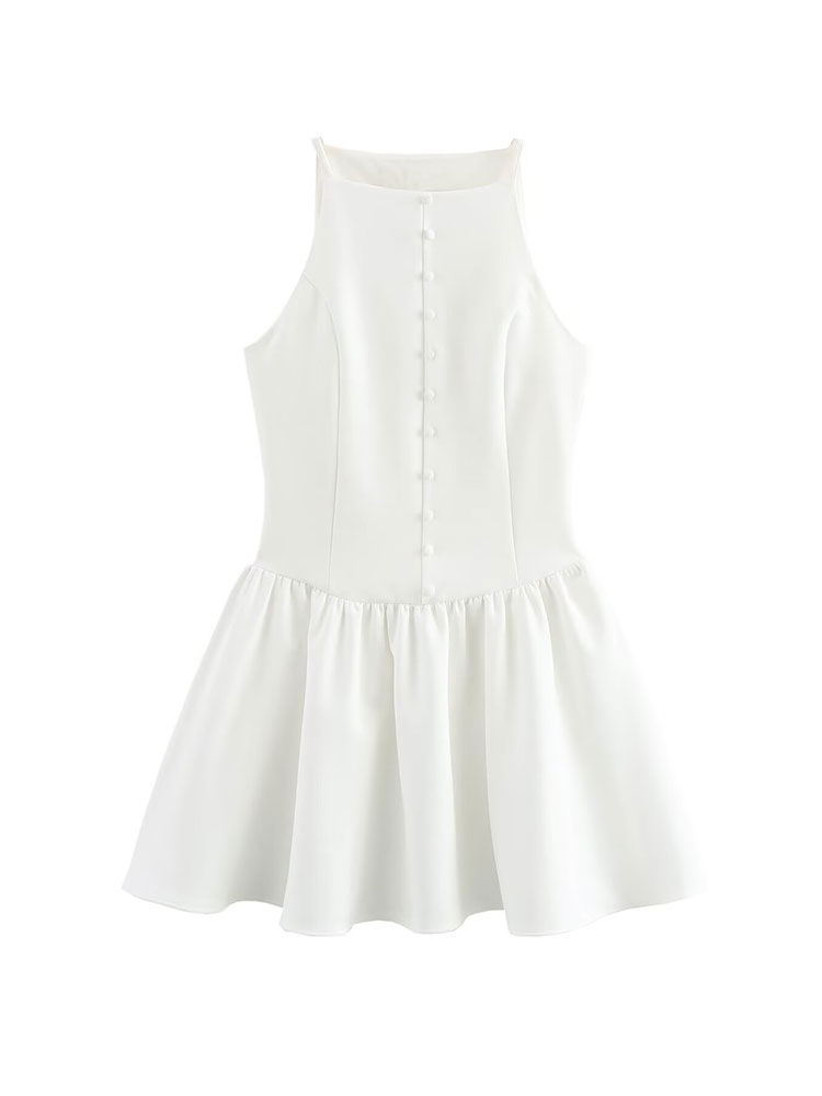 Halter Neck Mini Dress, Solid A-Line Club Dress, Polyester Button Detail