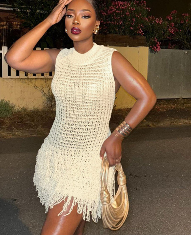 Sleeveless Knit Mini Dress, O-Neck Sheath Pullover, Ruched Patchwork Tassel