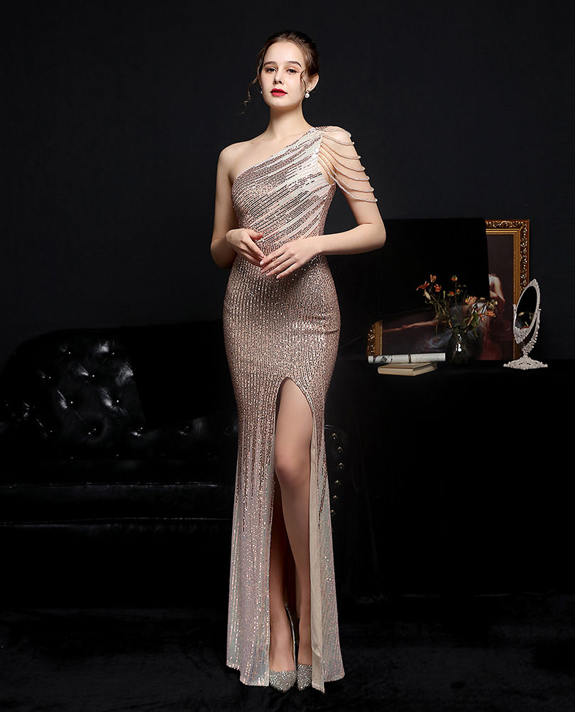 Mermaid Evening Gown, One-Shoulder Formal Dress, Sequin Beaded with Slit