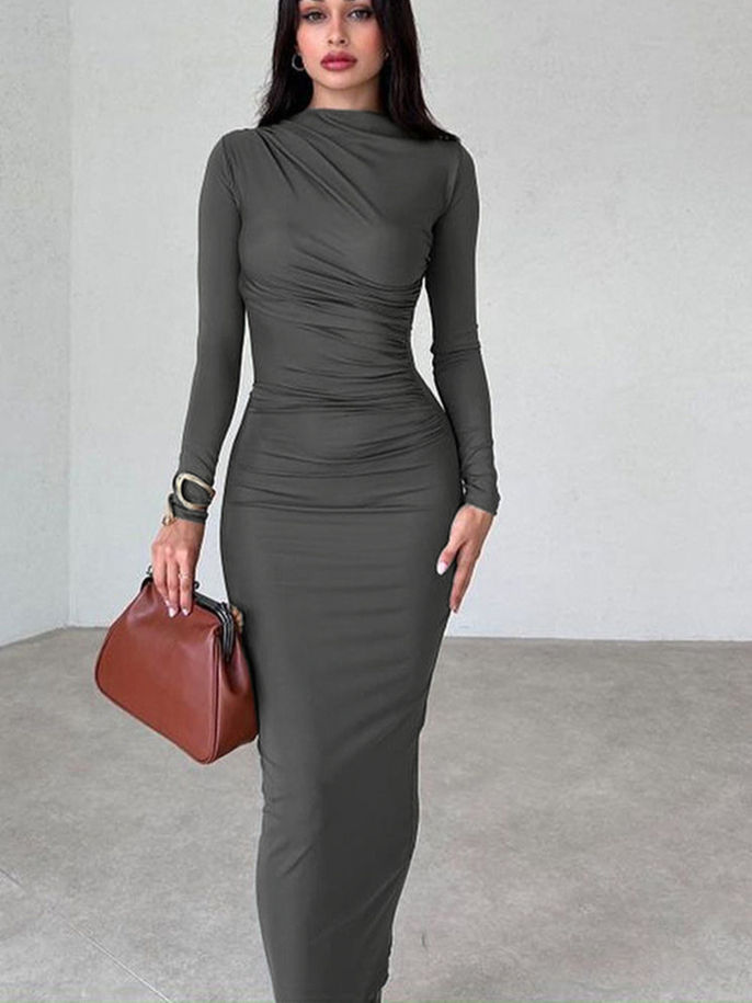 O-Neck Long Sleeve Maxi Dress, Solid Bodycon Gown, Ankle-Length Patchwork