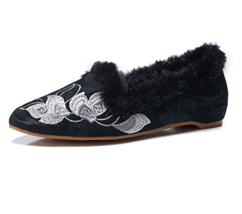 Ethnic Embroidered Pointed Toe Pumps, Slip-On Canvas Loafers, Plush Lined