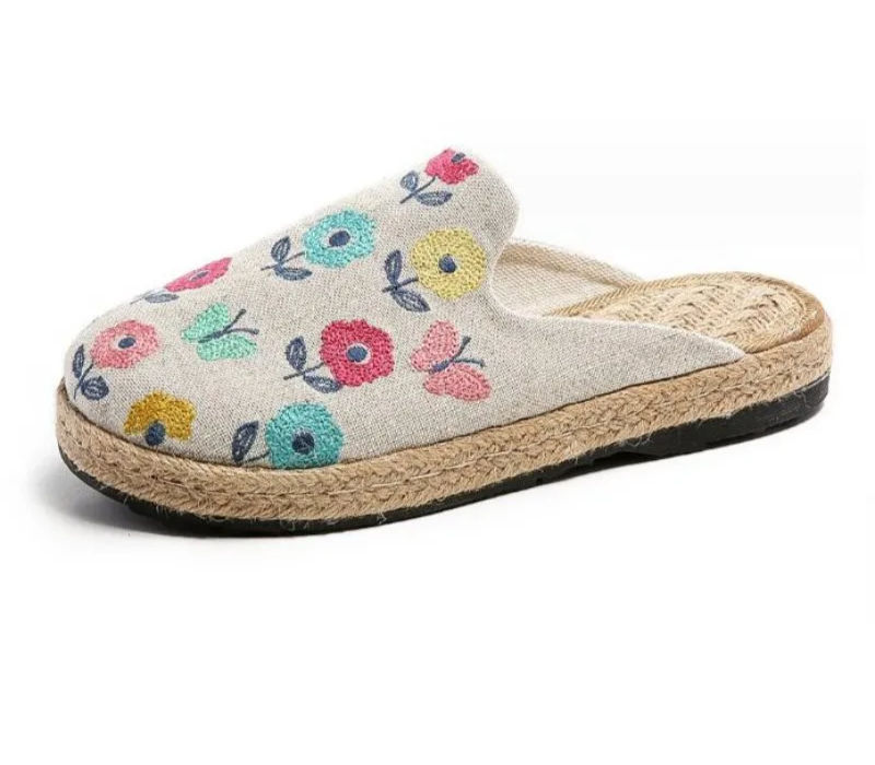 Wide Toe Embroidered Canvas Slides Retro Flat Slippers