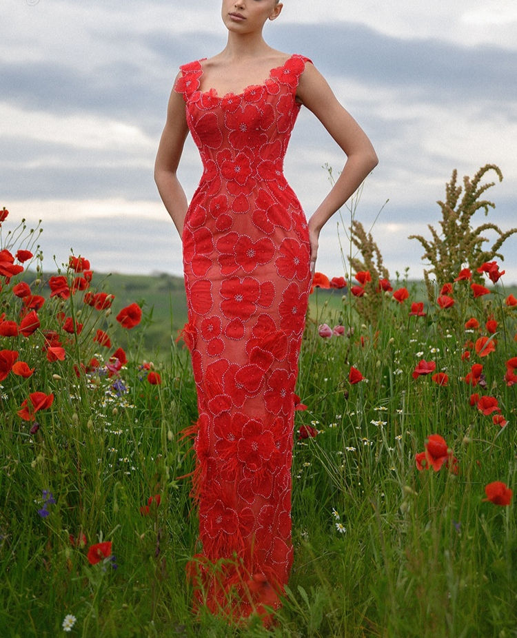 Red Sleeveless Spaghetti Strap Ankle-Length Dress, Slim Knit Polyester Mermaid P
