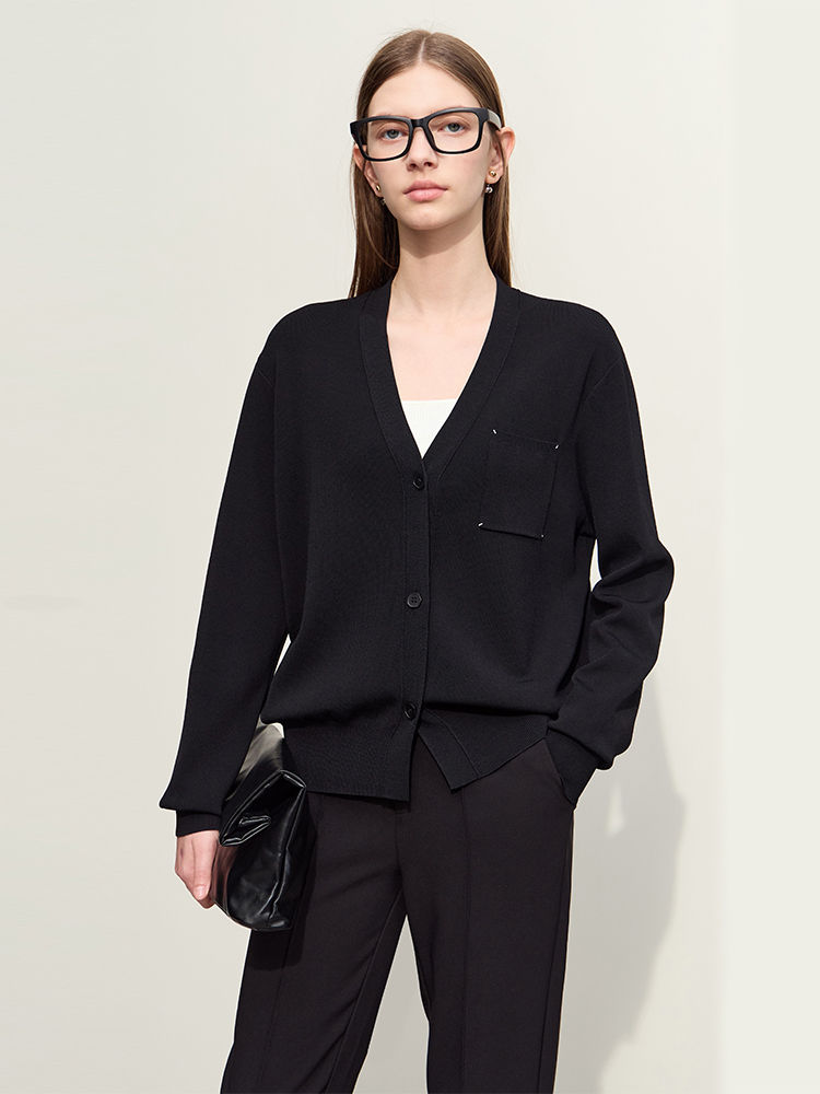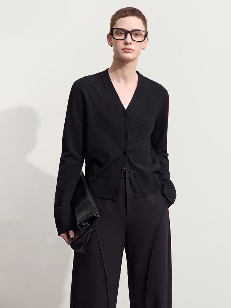 V-Neck Knit Cardigan with Buttons, Long Sleeves, Solid Acrylic Wool Blend Top