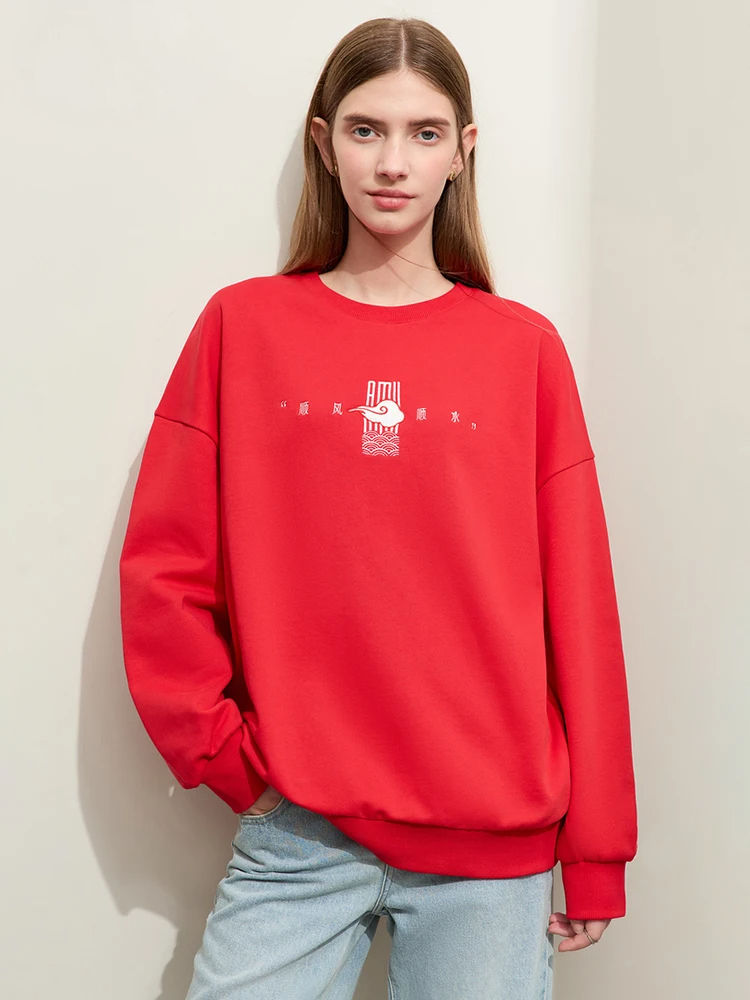 Cotton Pullover Hoodie O-Neck Loose Fit with Letter Embroidery Chinese Style Top