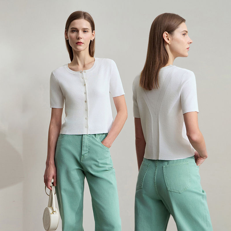 Summer Knit Top Solid Short Sleeve O-Neck Slim Fit Viscose Nylon Blend Knitwear
