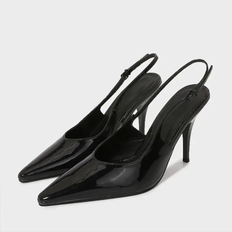 Miley Cyrus Black Patent Leather Slingback Pumps, Pointed Toe Stiletto Heels