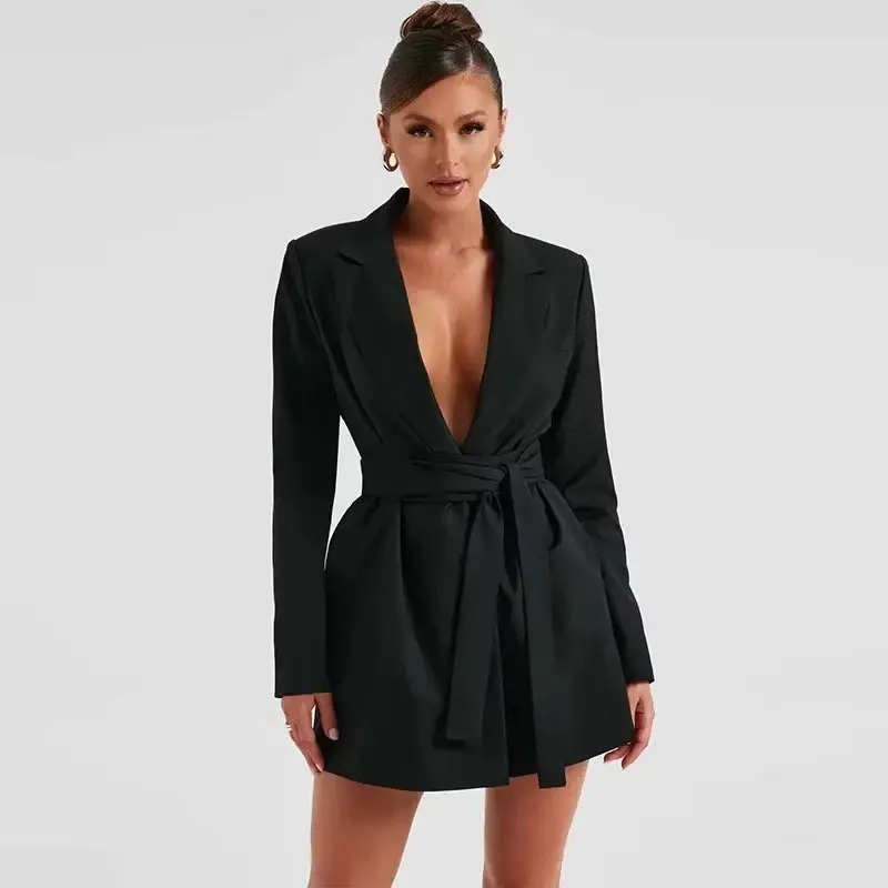 Hailey Bieber Black Blazer Short Dress, Long Sleeve Wrap Dress with Waist Belt