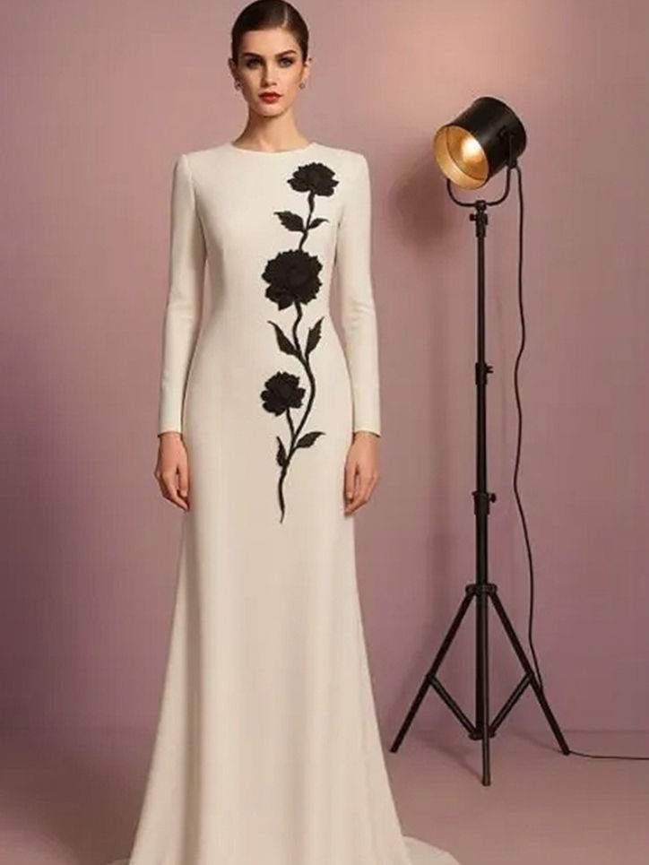 Floral Embroidery Mermaid Gown, Backless Bodycon Dress, Floor-Length Ruffle