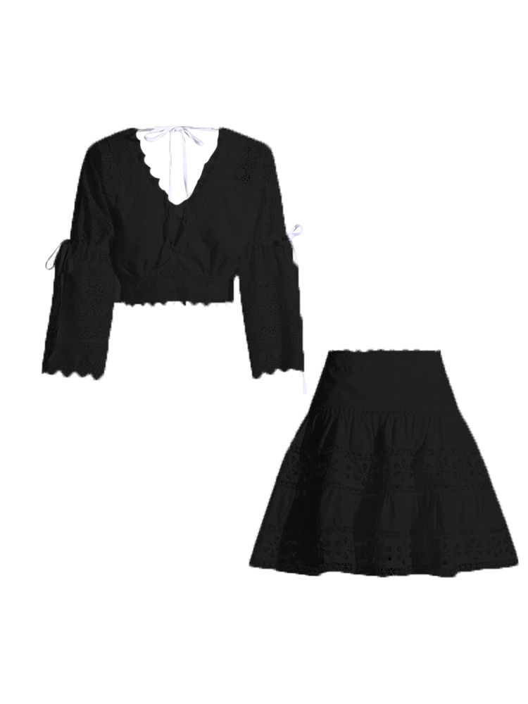 Two Piece Co-ord Set, V-Neck Hollow Out Top, Backless Flare Sleeve Outfit