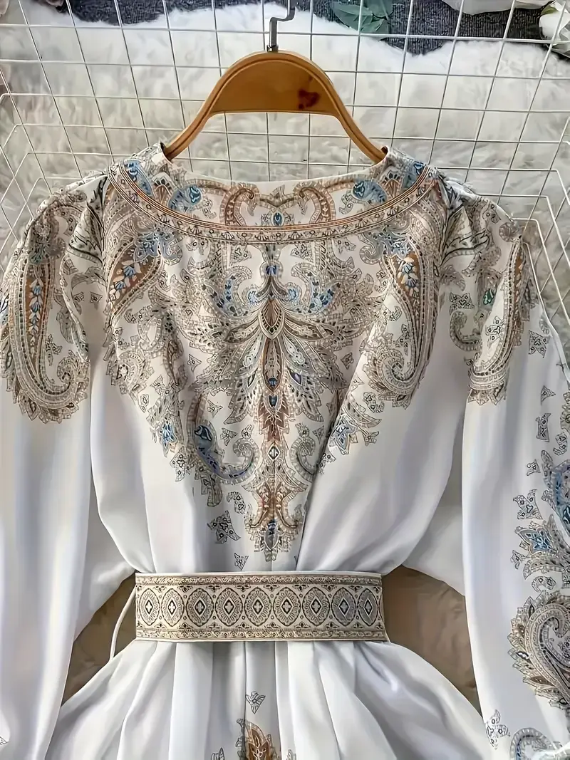 Beach Floral Print Tierred Ankle Dress O-Neck A-Line Half Lantern Sleeve