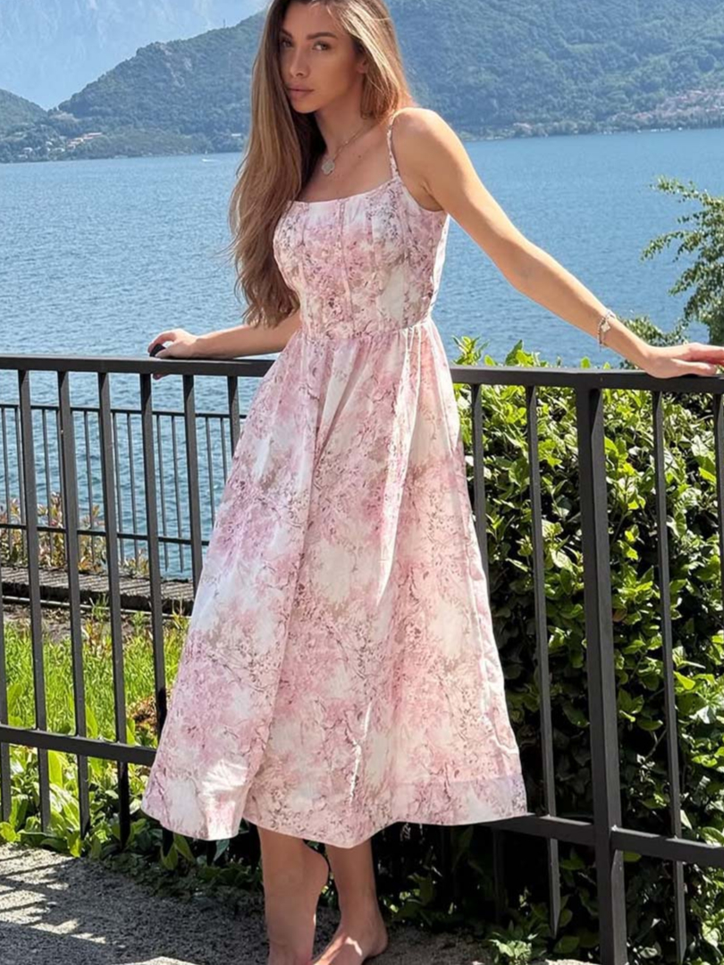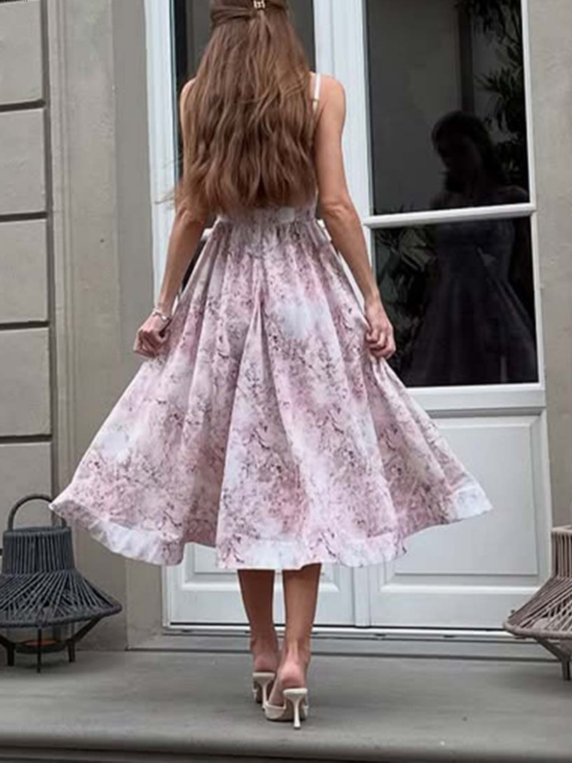 Printed Fit and Flare Midi Dress, Pink Spaghetti Strap, Open Back Pullover