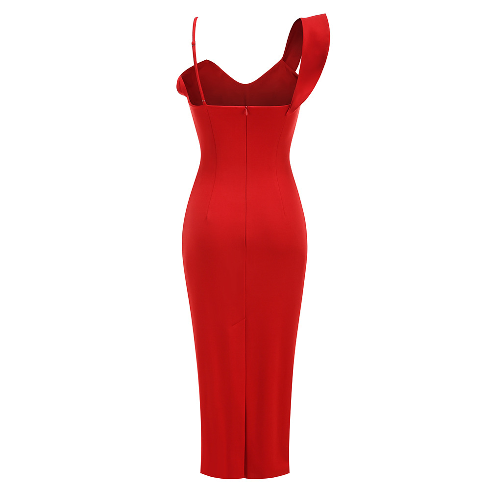 Spaghetti Strap Bandage Dress, Ruffled A Line Midi, Red Cocktail Gown