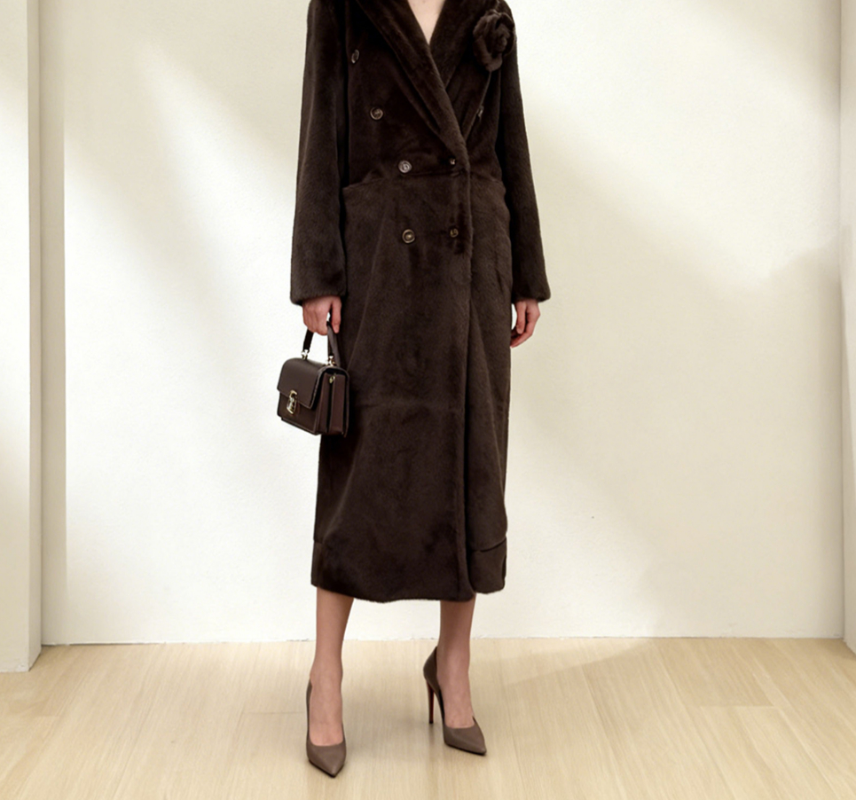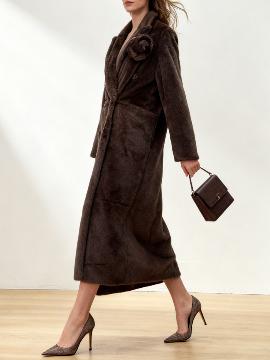 Spliced Midi Jacket, Double Breasted Coat with Lapel Collar, Fur Trim Pockets
