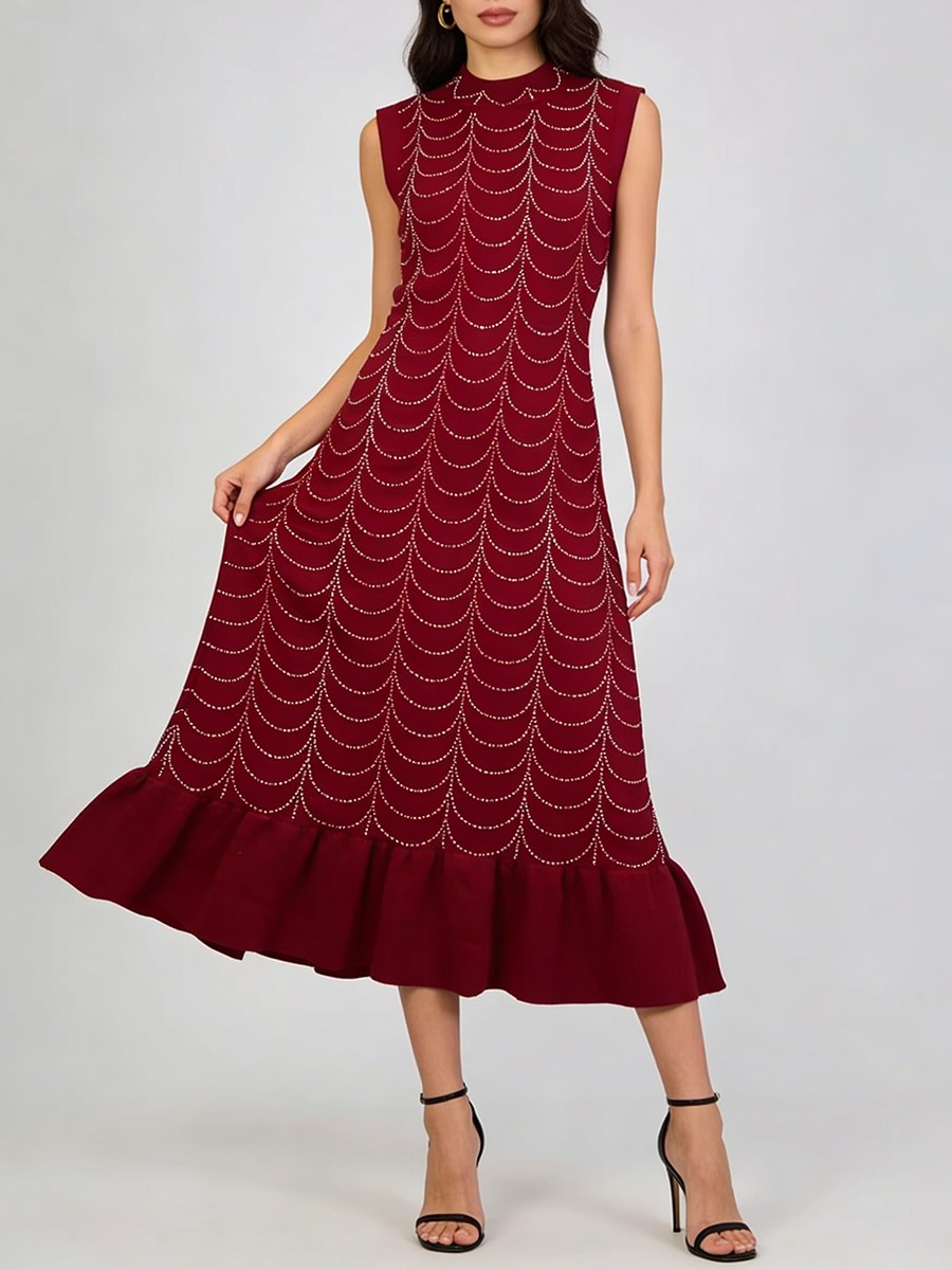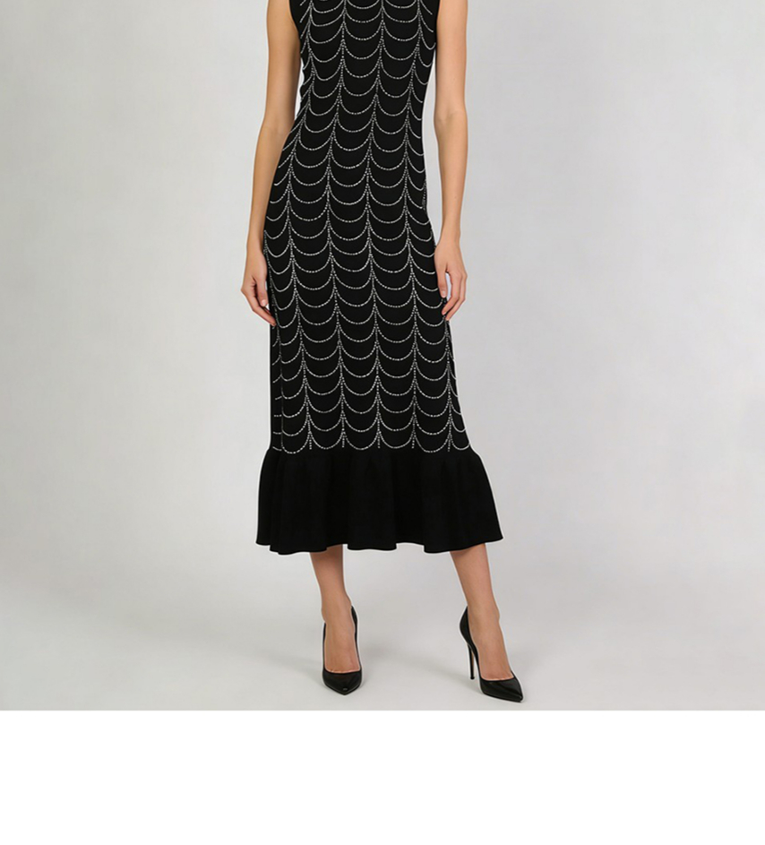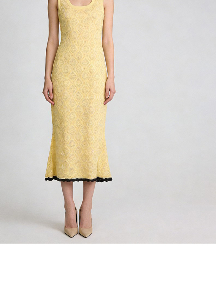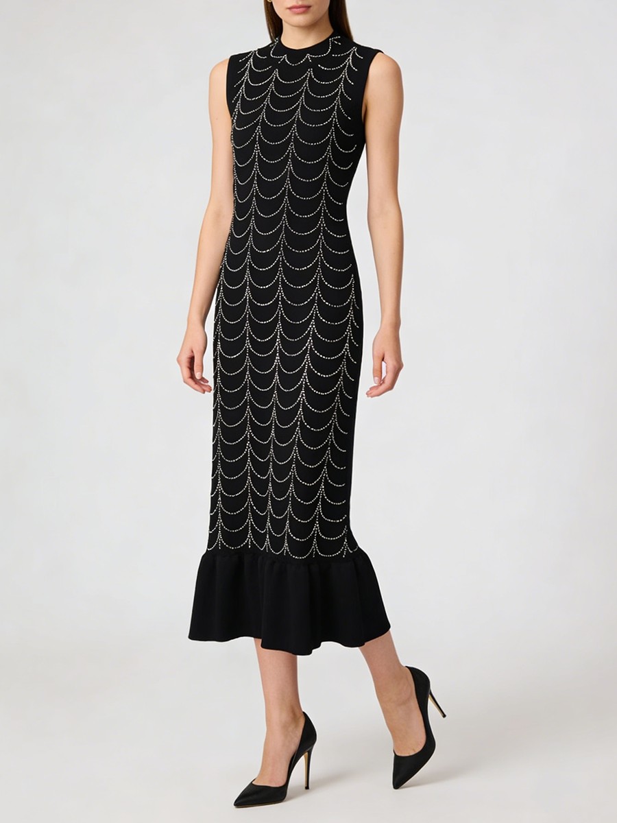 This sleeveless knit dress features a flattering square neckline and a striking trumpet/mermaid silhouette that flows to ankle length. Its patchwork pattern adds a unique touch, making it a standout piece for transitional weather...