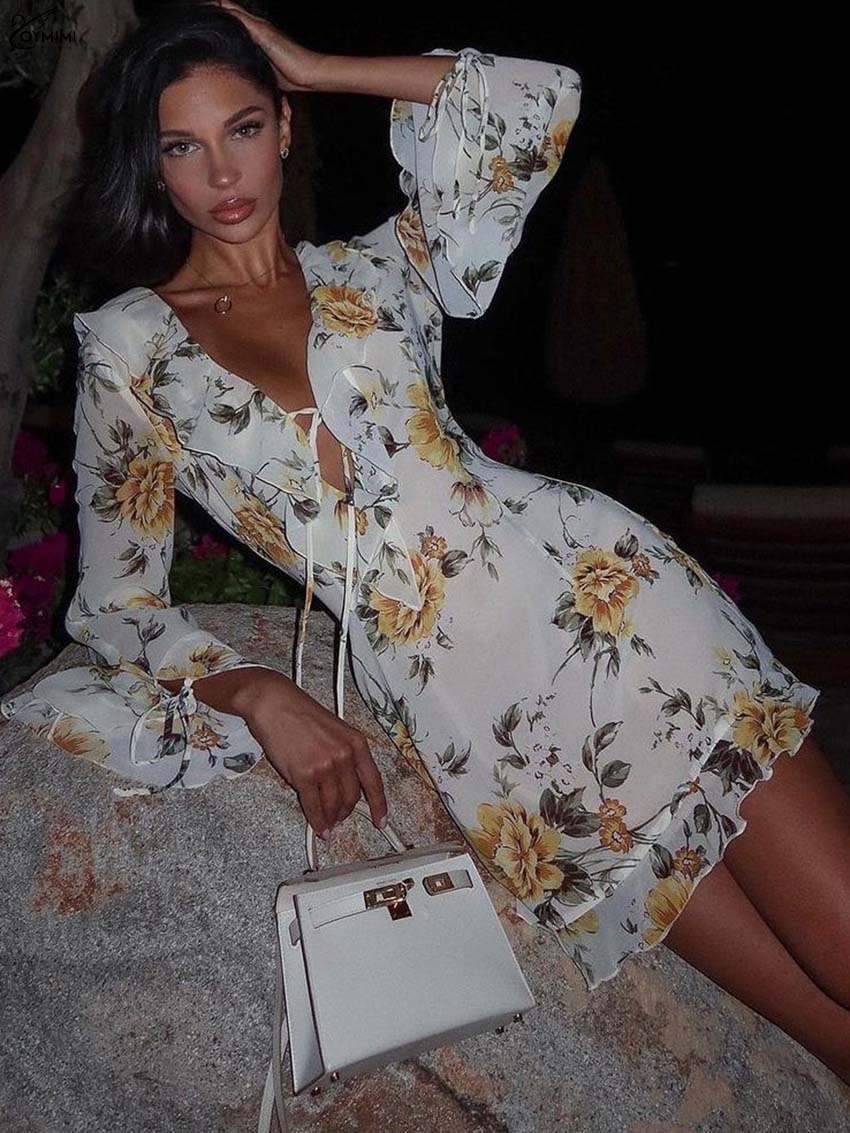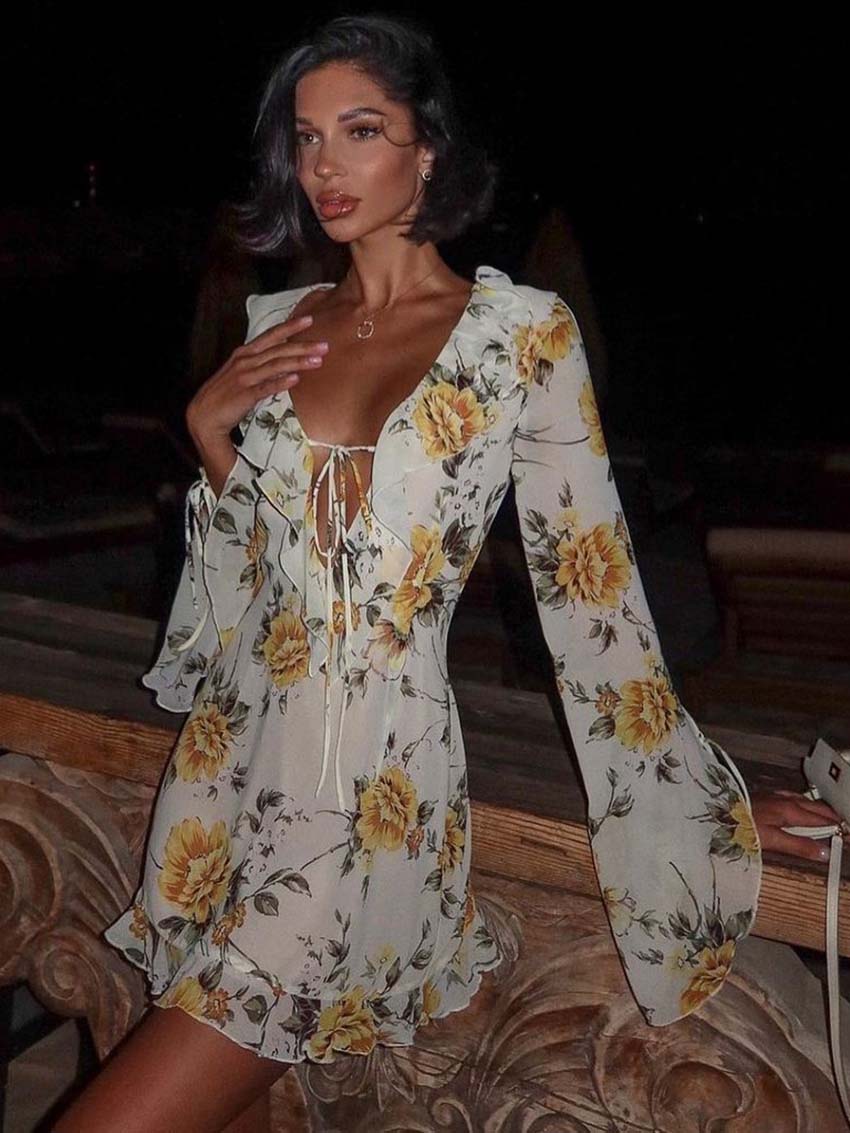 Ruffled Mini Dress, Long Sleeve V Neck Pullover, White Print Pleated Dress