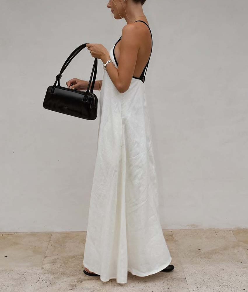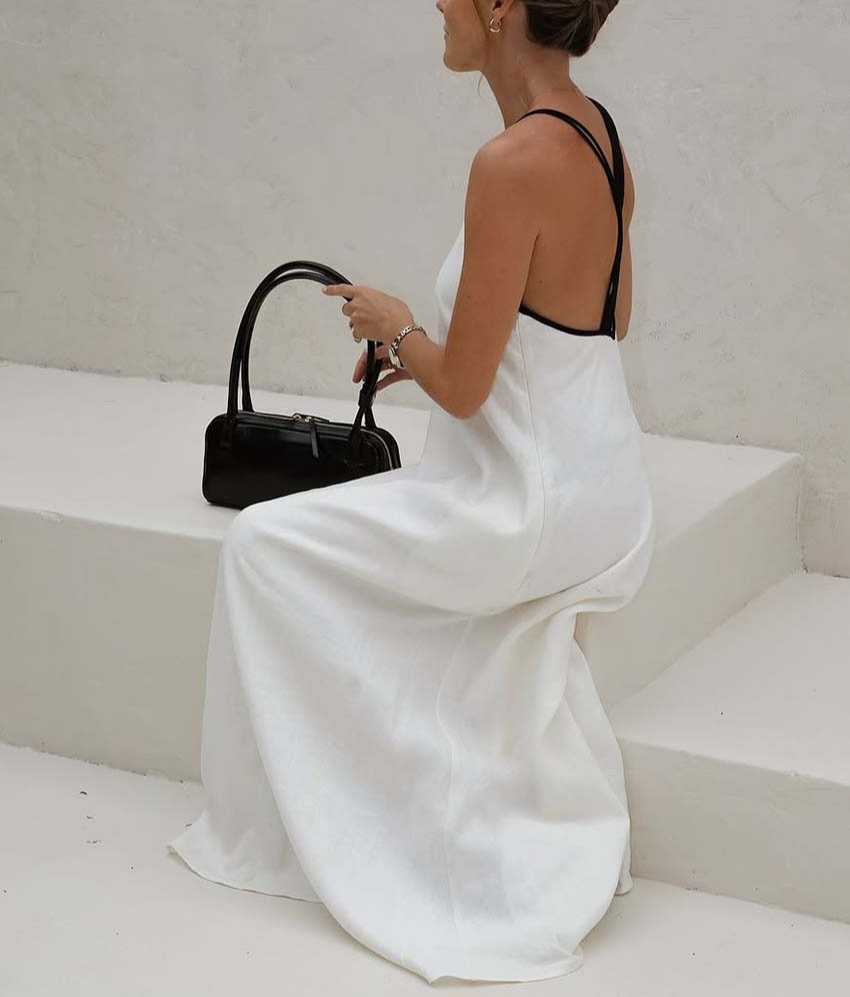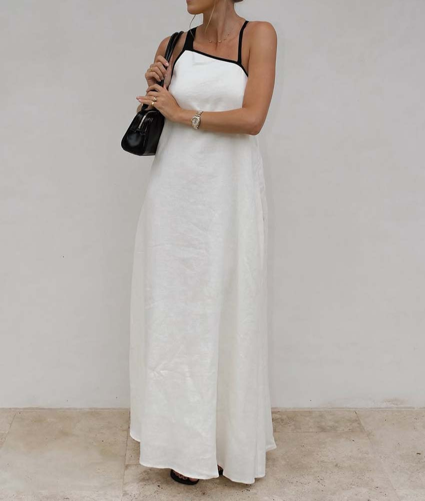 Open Back Maxi Dress, Sleeveless Pullover Gown, White Cotton, Contrast Strap