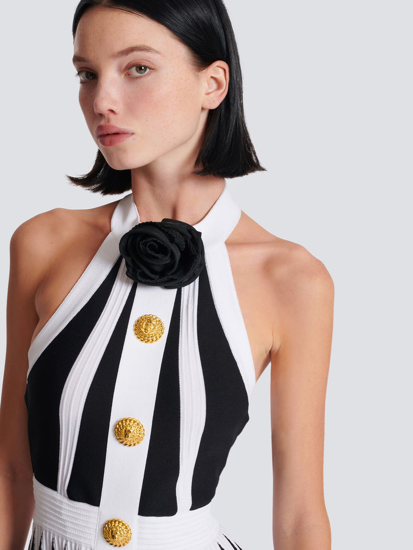 Halter Neck Sleeveless Mid-Calf Length Dress with Buttons White & Black Patchwor