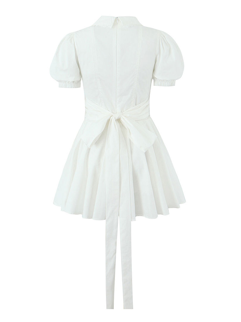 White Mini Dress Cotton Blend Lace Decor Short Puff Sleeve Lapel Collar Corset S