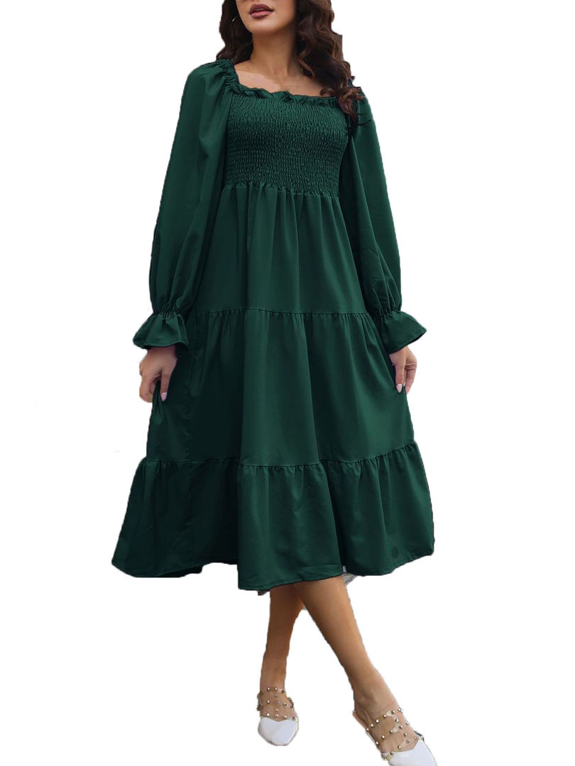 women's mid calf dress, A line dress with sleeves, square neck midi dress, full sleeve casual dress, polyester A line dress, comfortable midi dress women, casual autumn dress, modest midi dress, solid color casual dress, pullover midi dress, dress with folds detail, everyday women's dress, versatile mid length dress, fall fashion midi dress