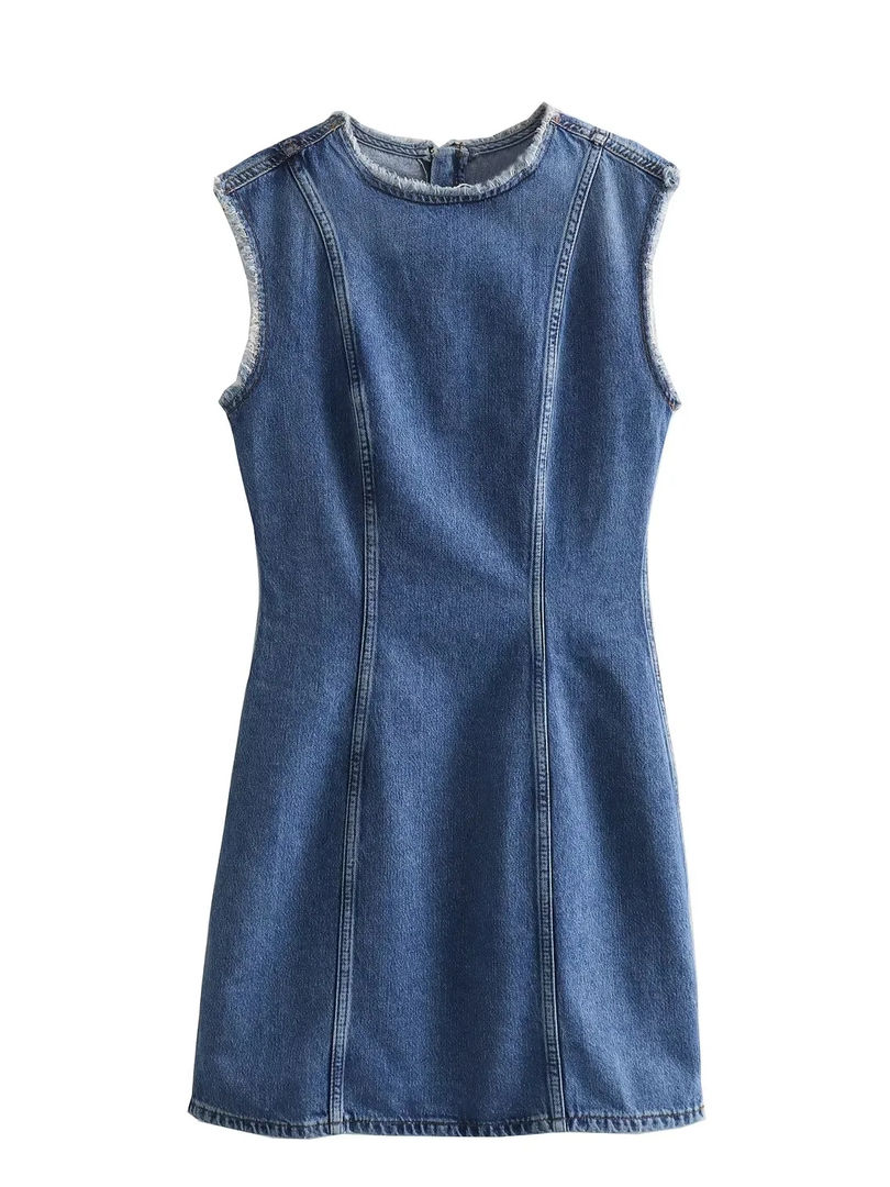 A-Line Mini Dress, Sleeveless O-Neck Vintage Dress, Solid Denim Blue Color