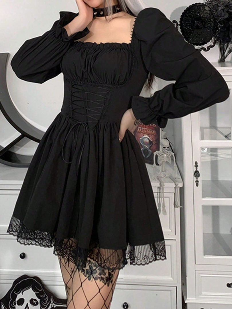 Black Gothic Vintage Lace Trashpunk Dress Long Sleeve Sq Neck Flared Midi