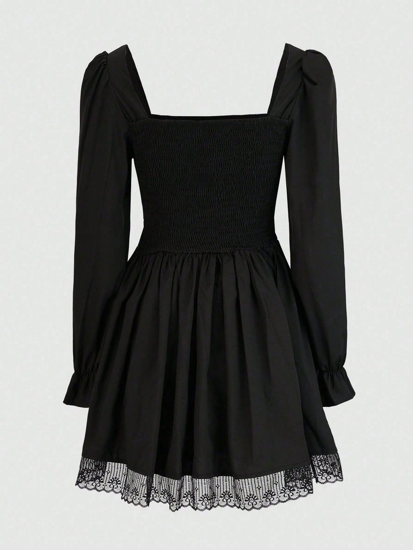 black ankle-length summer dress, cute preppy style dress for juniors, long sleeve square neck dress women, black lace detail A-line dress, regular fit summer occasion dress, breathable high waist black dress, flared hem midi dress homecoming, comfortable polyester microfiber dress, drawstring detail black dress, elegant casual black dress for teens, summer party dress long sleeve, plain black cute dress, junior's A-line ankle dress, slight stretch black summer dress.