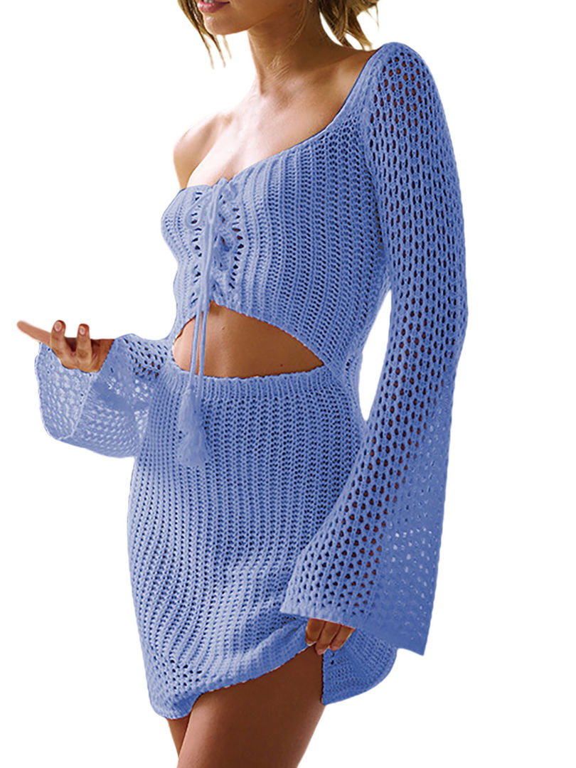 White Crochet Knitted Beach Cover-up Dress Sleeveless O-Neck Knee-Length Solid A