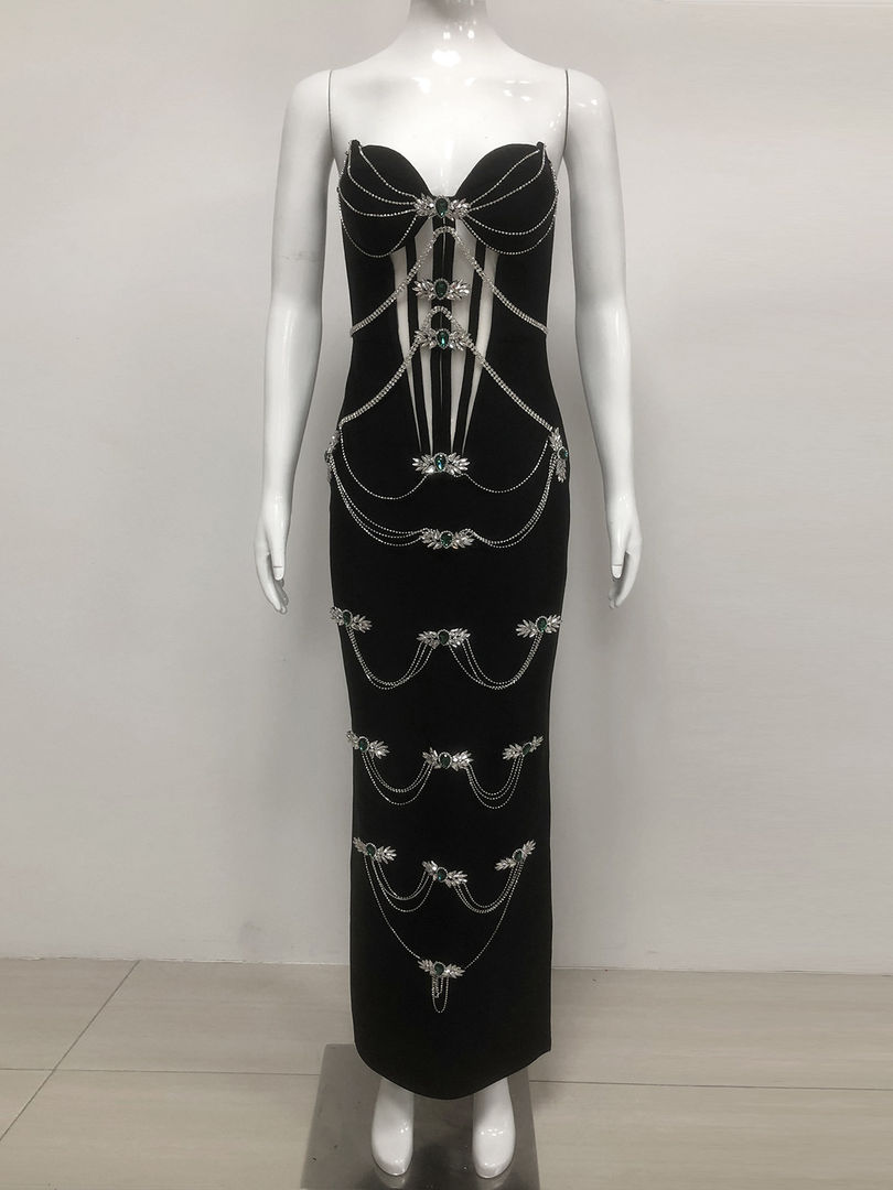 Bodycon Bandage Maxi Dress, Strapless High Waist Gown, Black with Metal Chain
