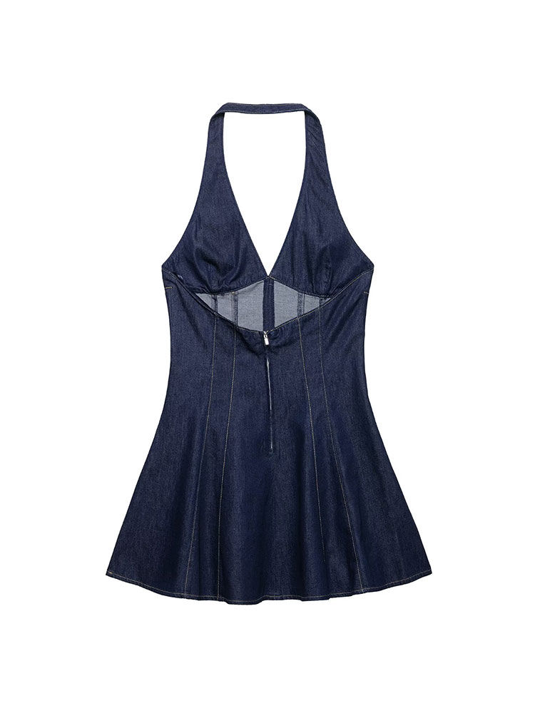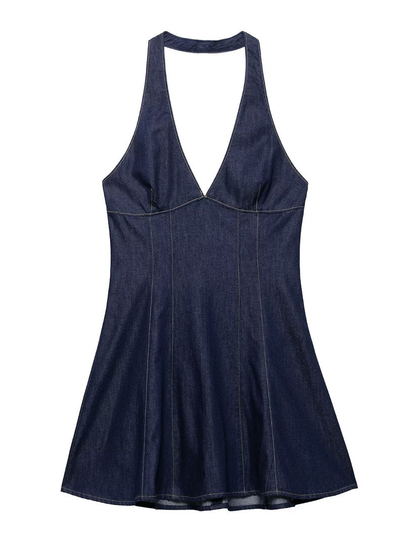 Tags: sleeveless denim style mini dress, A-line spaghetti strap summer dress, casual V-neck mini dress for women, lightweight denim look party dress, solid blue A-line sundress, women's above the knee summer dress, draped V-neck casual dress, spaghetti strap A-line dress casual, cute summer dresses for vacation, flattering A-line mini dress, non-stretch polyester sundress, women's casual summer outfit, V-neck spaghetti strap denim dress, regular fit solid color mini dress