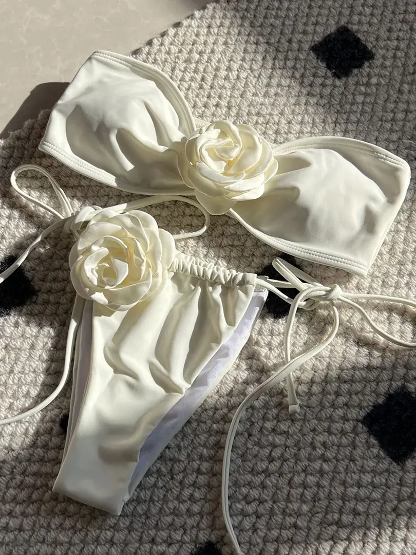 3D Floral Strapless Bandeau Bikini Swimsuit Two Piece Swimwear