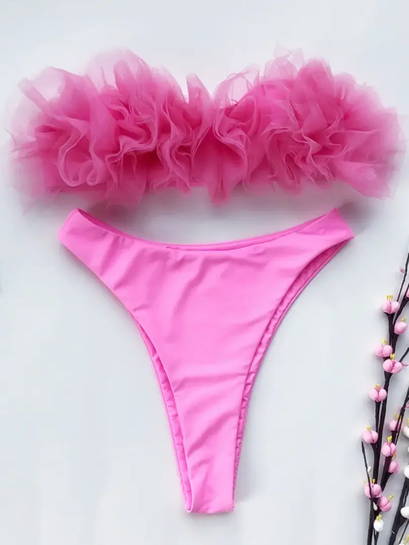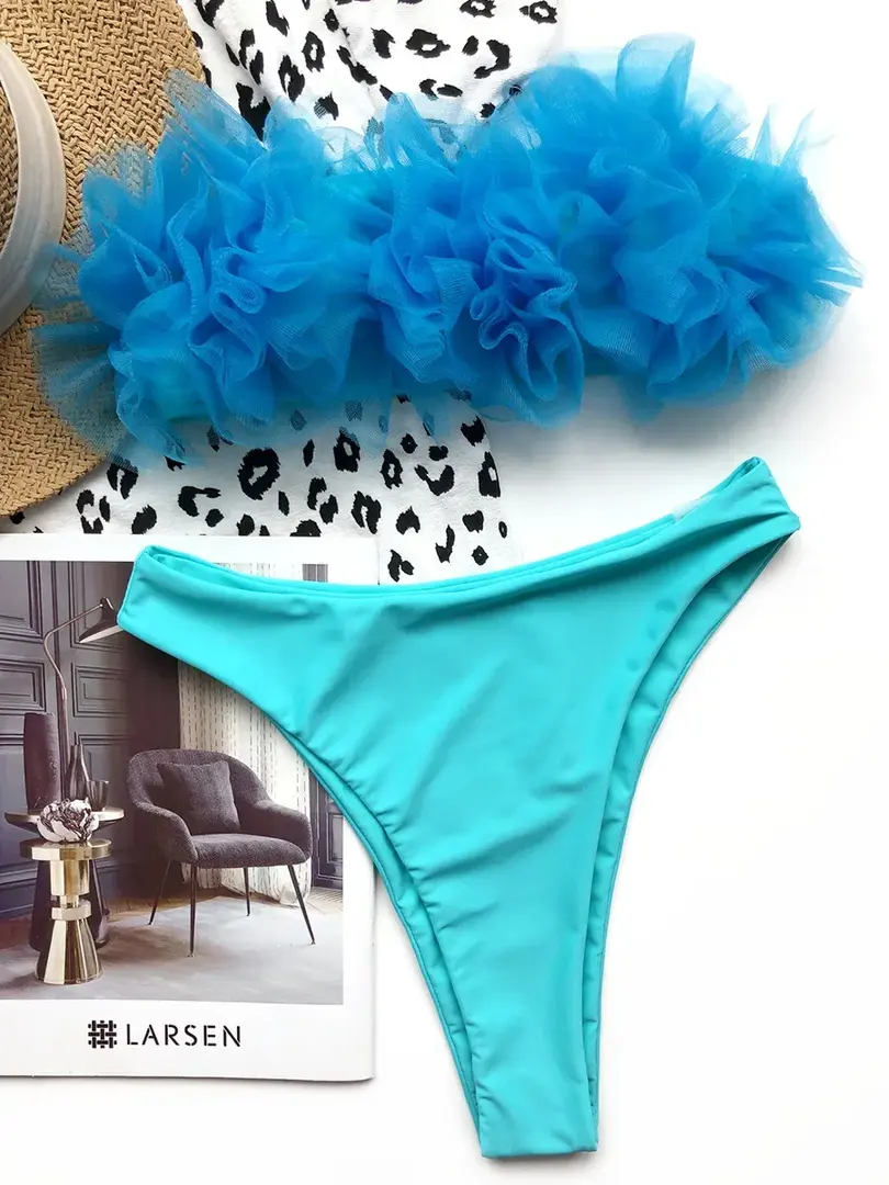 3D Flower Mesh Ruffled Bikini High Waist Swimsuit Bandeau