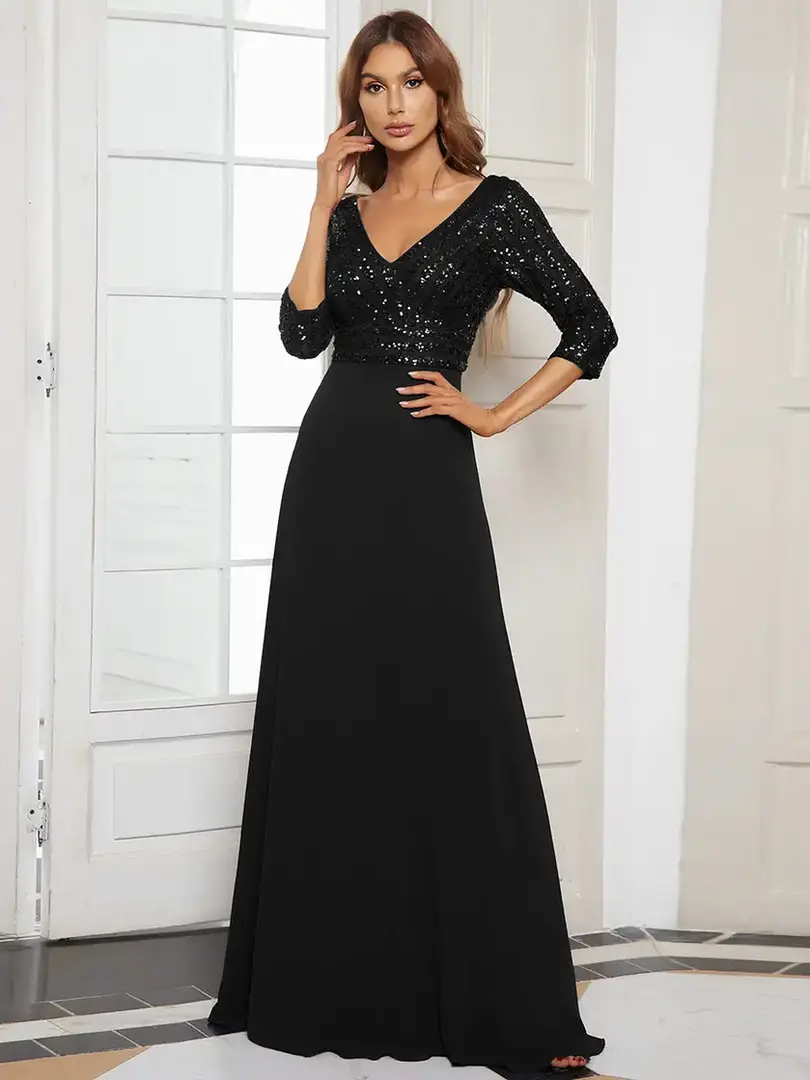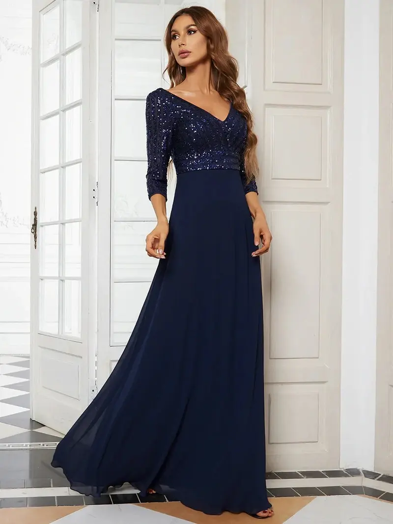 Look breathtaking in this exquisite A-line evening dress. The flowing chiffon fabric drapes beautifully, while delicate lace appliques and playful tassels add a touch of whimsy. The three-quarter sleeves offer a touch of coverage, and the V-neckline flatters all ages. Perfect for formal evenings, this dress is sure to turn heads.