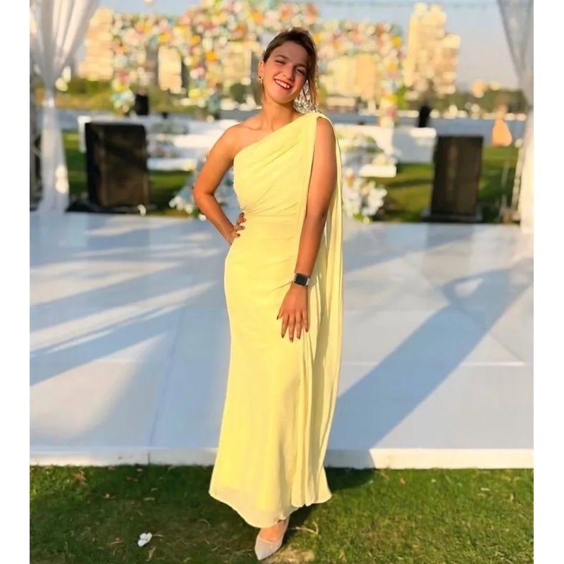 Tags: Long yellow prom dress, one shoulder prom dress, mermaid prom dress, satin evening gown, formal dress with slit, sleeveless prom dress, classic prom dress, floor length prom dress, built in bra prom dress, trumpet silhouette dress, one shoulder evening gown, candy color prom dress, non-woven fabric dress, polyester prom dress.