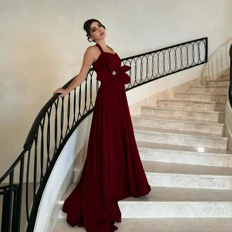 Tags:red satin prom dress, halter neck evening gown, floor length party dress, elegant women's prom gown, sleeveless formal dress, A-line silhouette evening dress, built in bra prom dress, simple style prom dress, affordable prom dress online, satin halter prom dress, long red evening gown, prom dress with 3D flowers, Saudi style prom dress, elegant prom dresses for women.