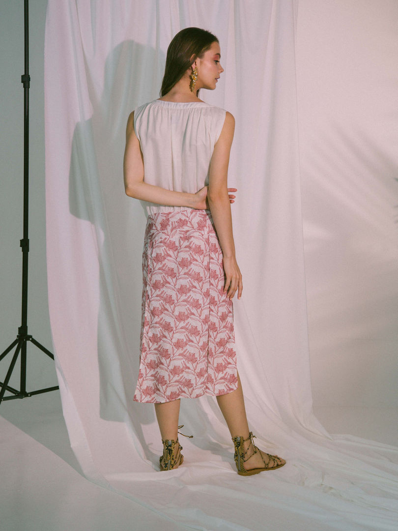 This floral print dress is both fresh and bold, perfect for making a statement. Crafted from soft, silky cupro, it features a drop waist that flatters with a slightly loose fit. The asymmetrical skirt boasts six unique splits, adding an element of surprise to every step.