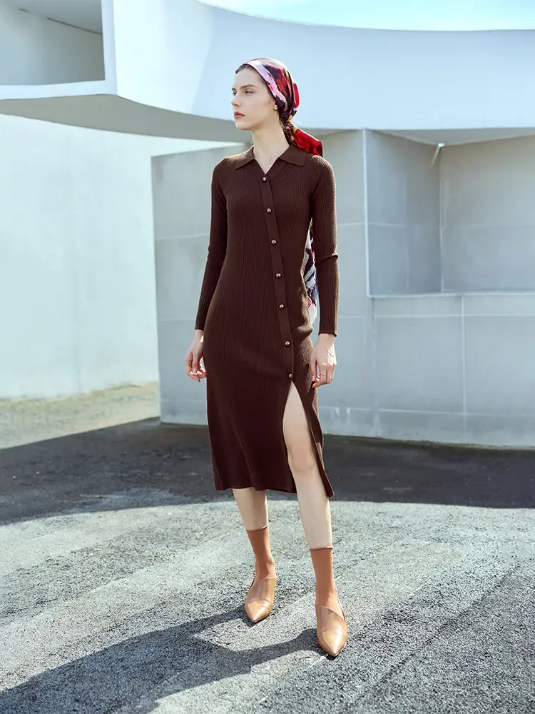 Tags:button down knitted dress women, wool blend midi dress, long sleeve office dress, A-line knit dress autumn, slim fit sweater dress, turn down collar dress, mid calf work dress, single breasted knit dress, fall fashion knit dress, professional women's dress, elegant midi dress for work, women's autumn knitted dress, long sleeve wool dress office, knit dress with buttons for women.
