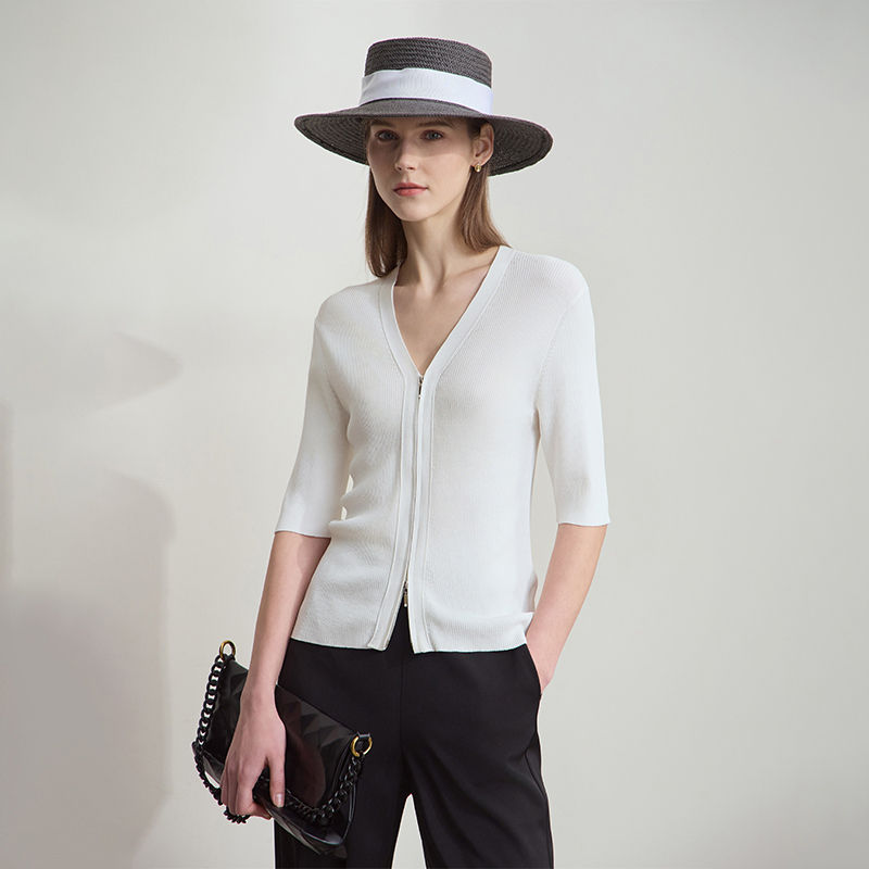 Tags:summer office cardigan, v neck knit cardigan, half sleeve cardigan women, zipper front cardigan, slim fit summer cardigan, elegant summer cardigan, viscose blend cardigan, lightweight summer cardigan, short sleeve cardigan for work, professional summer cardigan, women's business casual cardigan, summer knit jacket, half sleeve knit top, fitted summer cardigan, summer office attire cardigan.