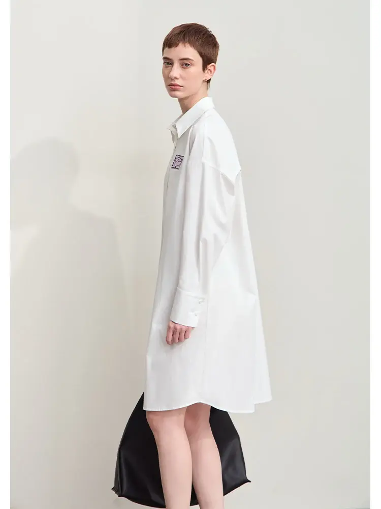 Cotton Knee-Length Dress, Lapel Neck, Rose Embroidery, Long Sleeve, Loose Fit Wo