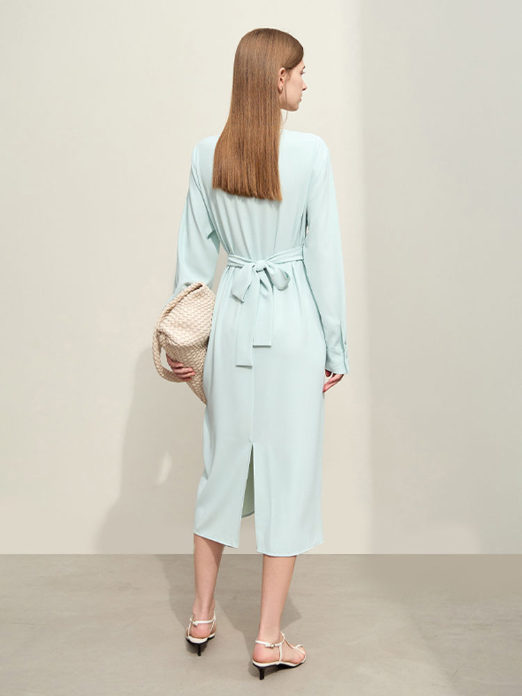 Mid-Calf Length A-Line Dress, Solid V-Neck, Long Sleeve, Loose Fit, Pleated Poly