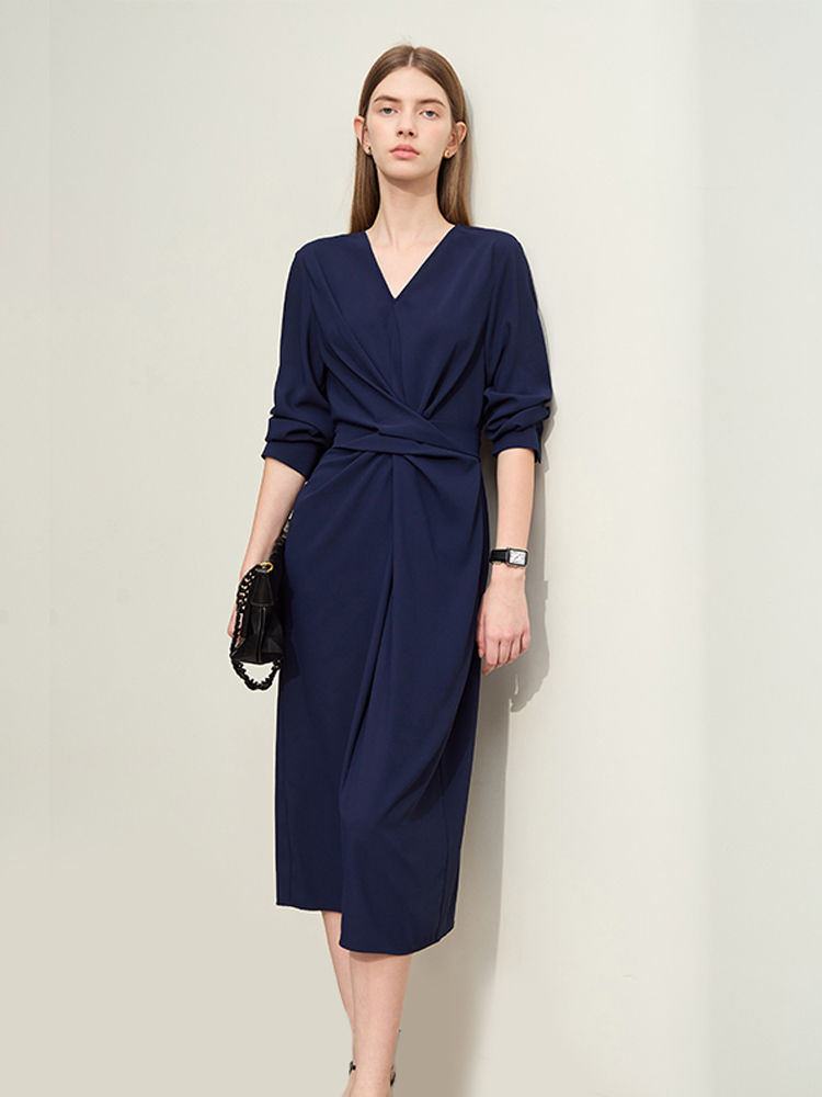Tags:V-neck midi dress for work, spring office lady dress, elegant pleated midi dress, women's spring A-line dress, loose fit midi dress with sleeves, solid color midi dress for women, commuter style midi dress, non-stretch midi dress, full sleeve midi dress for spring, patchwork detail midi dress, V-neck polyester dress, spring 2024 midi dress trends, women's midi dress for middle age, casual office midi dress.