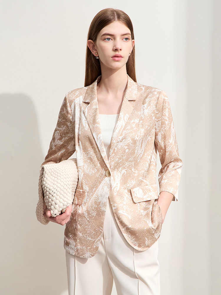 Silk Spandex Blend Blazer Notched Collar Printed Three Quarter Sleeve Stretch Ba