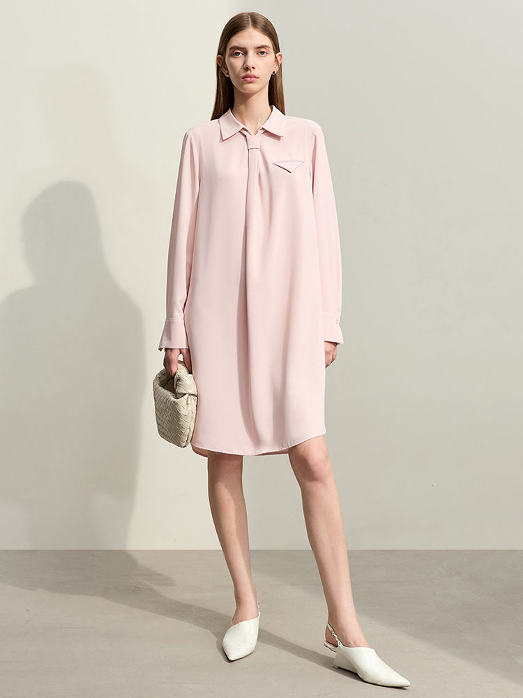 Lapel Neck Knee-Length Dress with Tie Detail, Long Sleeves, Button Closure, Loos